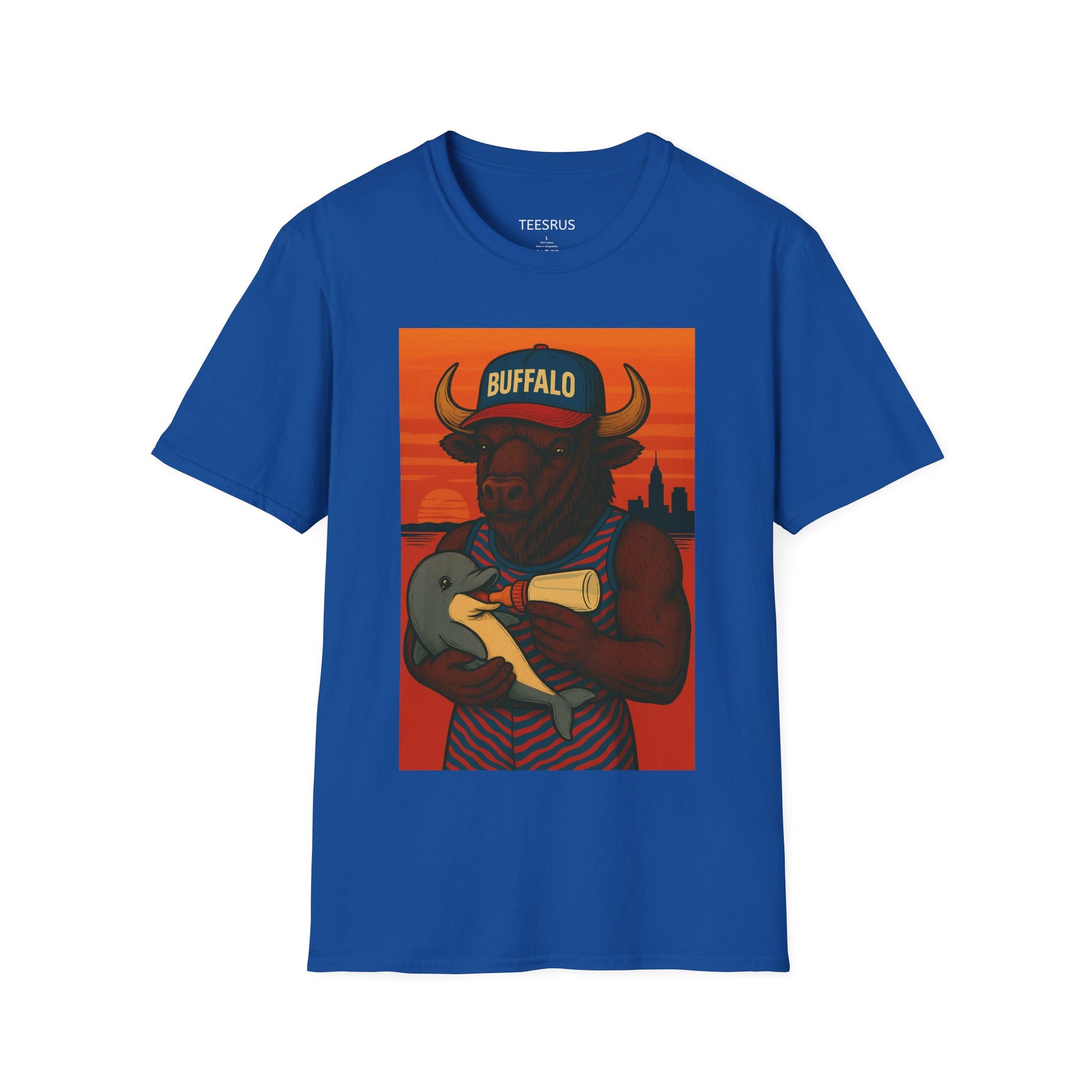 This T-Shirt features a unique and playful design of a Buffalo feeding its baby Dolphin, adding a touch of whimsy to your wardrobe. The soft, lightweight fabric and classic fit with a crew neckline ensure comfort and versatility for all occasions, making it perfect for adults looking for a fun and stylish addition to their casual wear collection. This shirt is ideal for animal lovers, and it's perfect for casual outings, family gatherings, or just lounging at home.