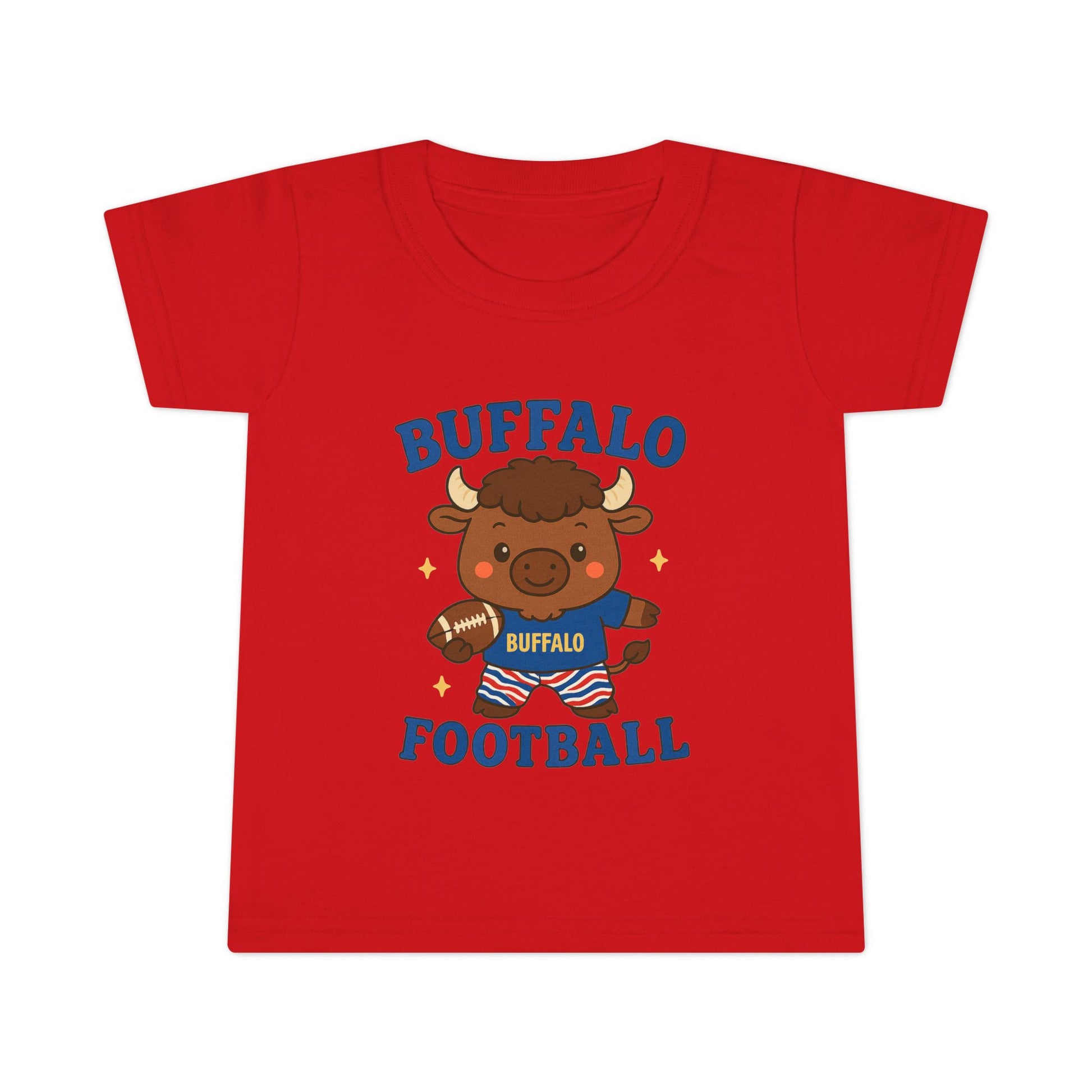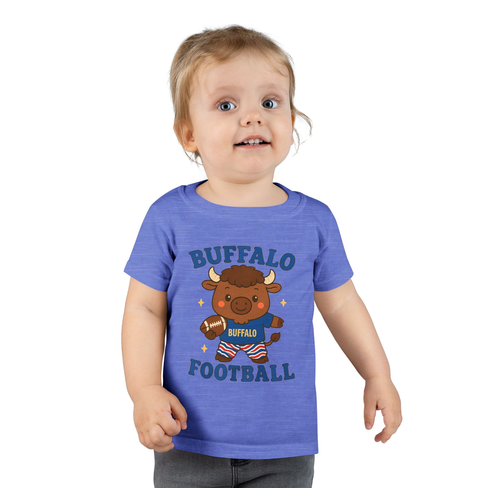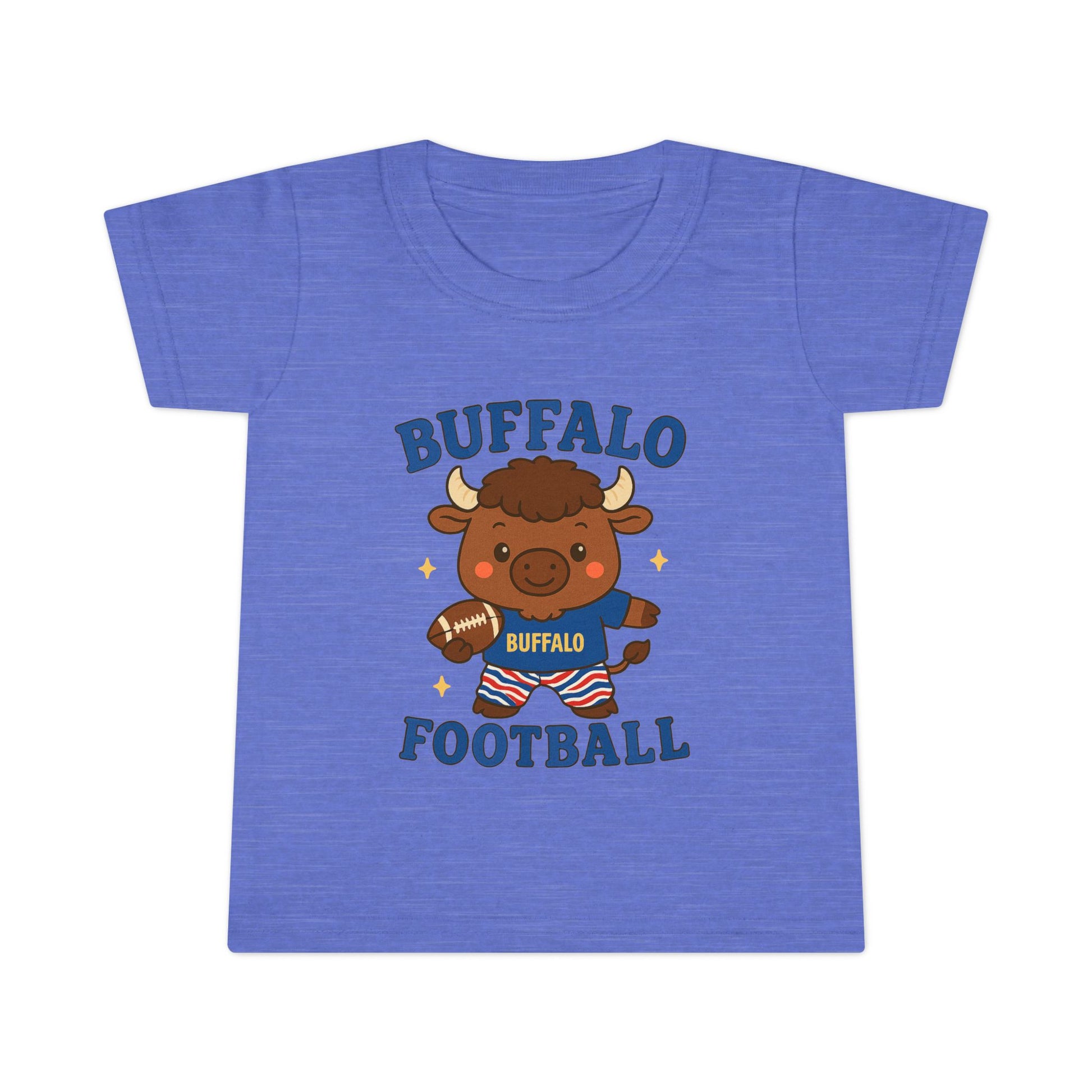 This TODDLER BUFFALO FOOTBALL TSHIRT exudes a playful and sporty vibe perfect for young football fans. It is ideal for toddlers who love football and want to show off their team spirit during game days or sporting events.