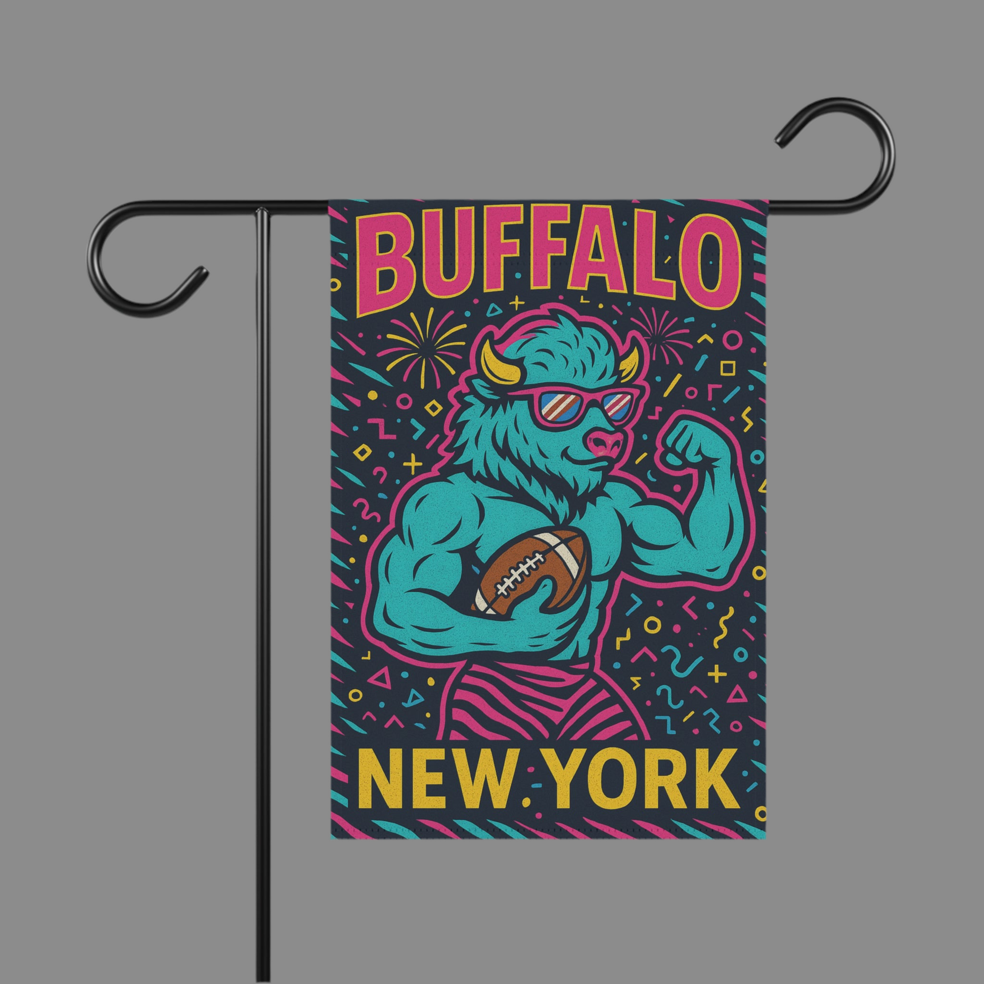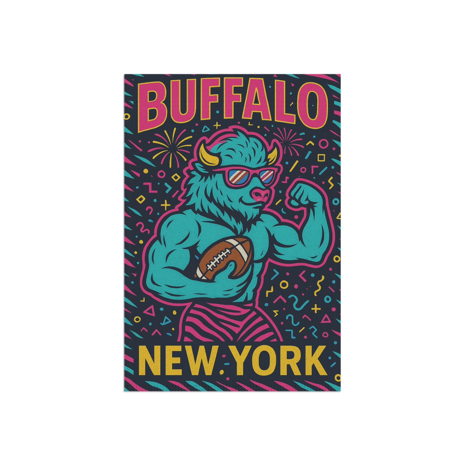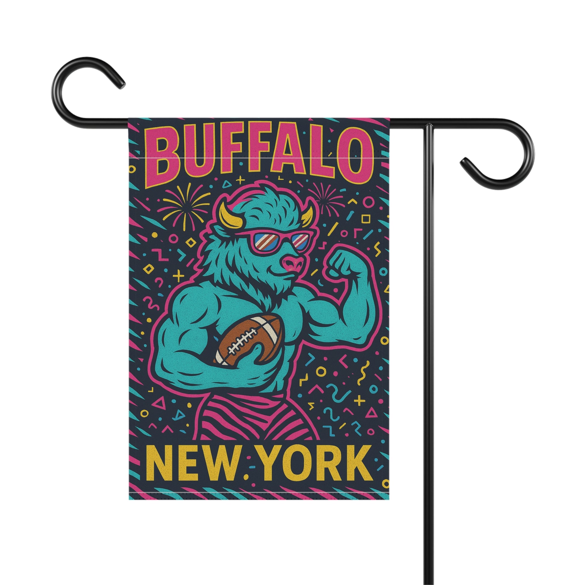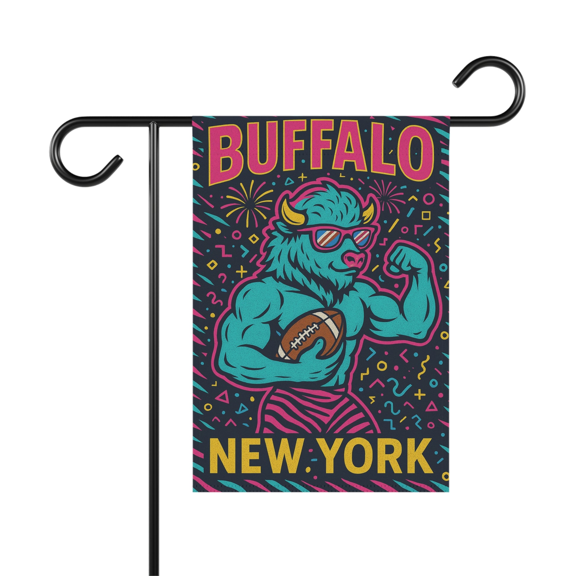 An eclectic Buffalo NY garden flag made from lightweight poly poplin-canvas fabric with vibrant colors that will add a pop of personality to your outdoor space. This flag is perfect for those who love unique and quirky decor in their gardens or homes. Ideal for decorating during Buffalo NY events, holidays, or to show pride in your city.