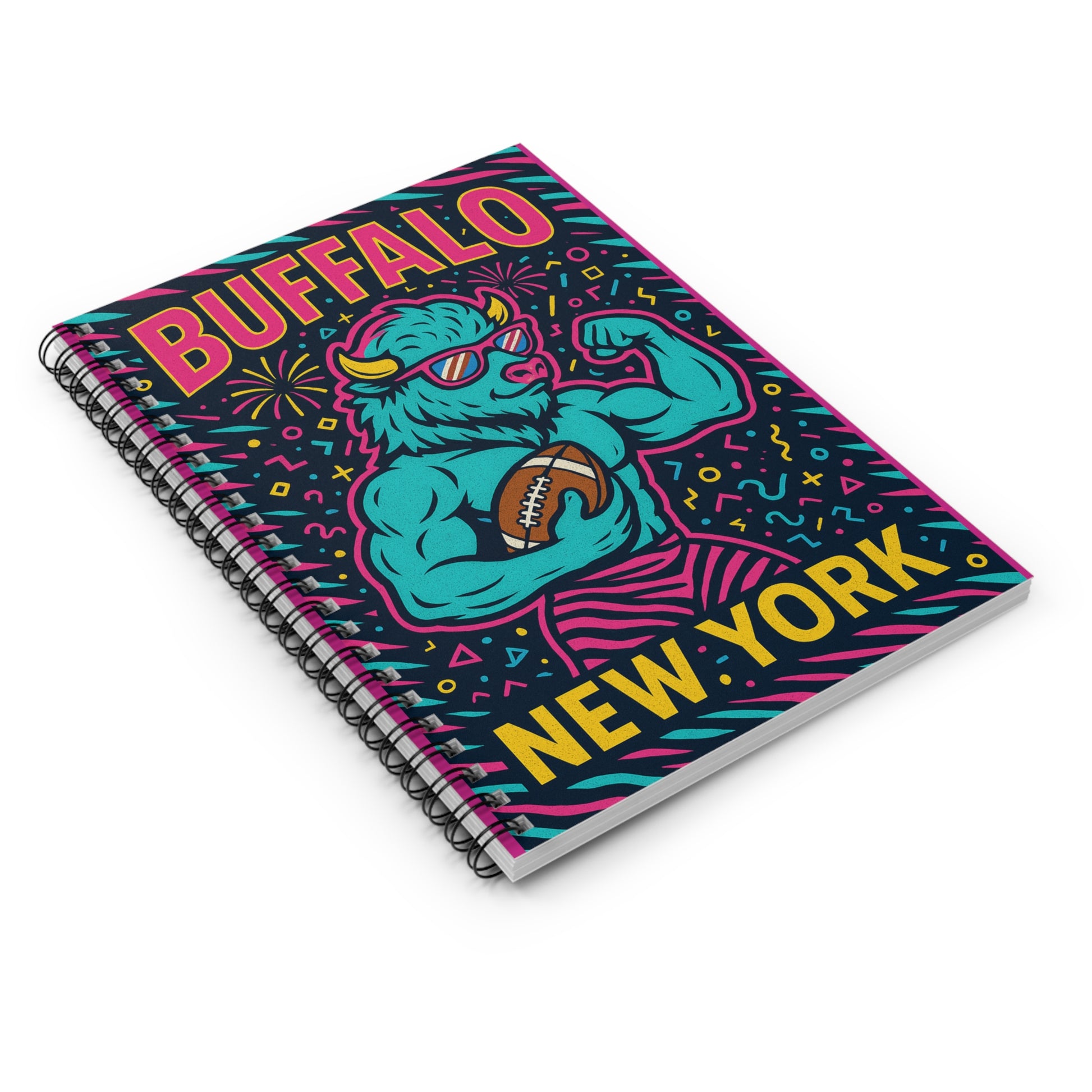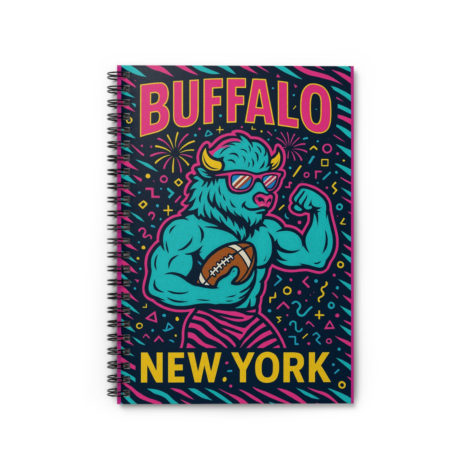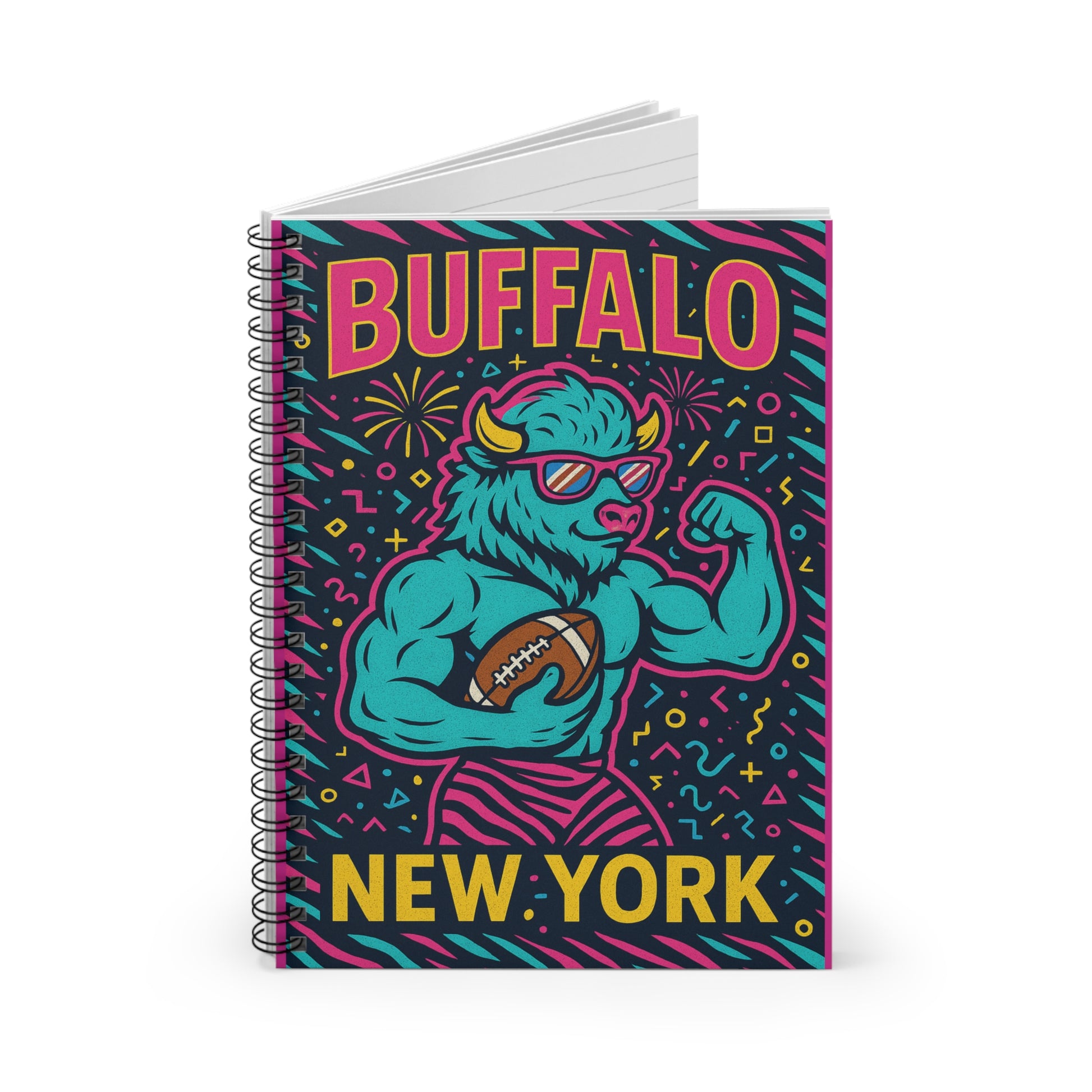 An eclectic Buffalo NY notebook that is perfect for writing, with a fancy metal spiral binding and a document pocket for added storage. The notebook is relevant to students, writers, and Buffalo enthusiasts, and is ideal for back-to-school, holidays, and everyday note-taking.