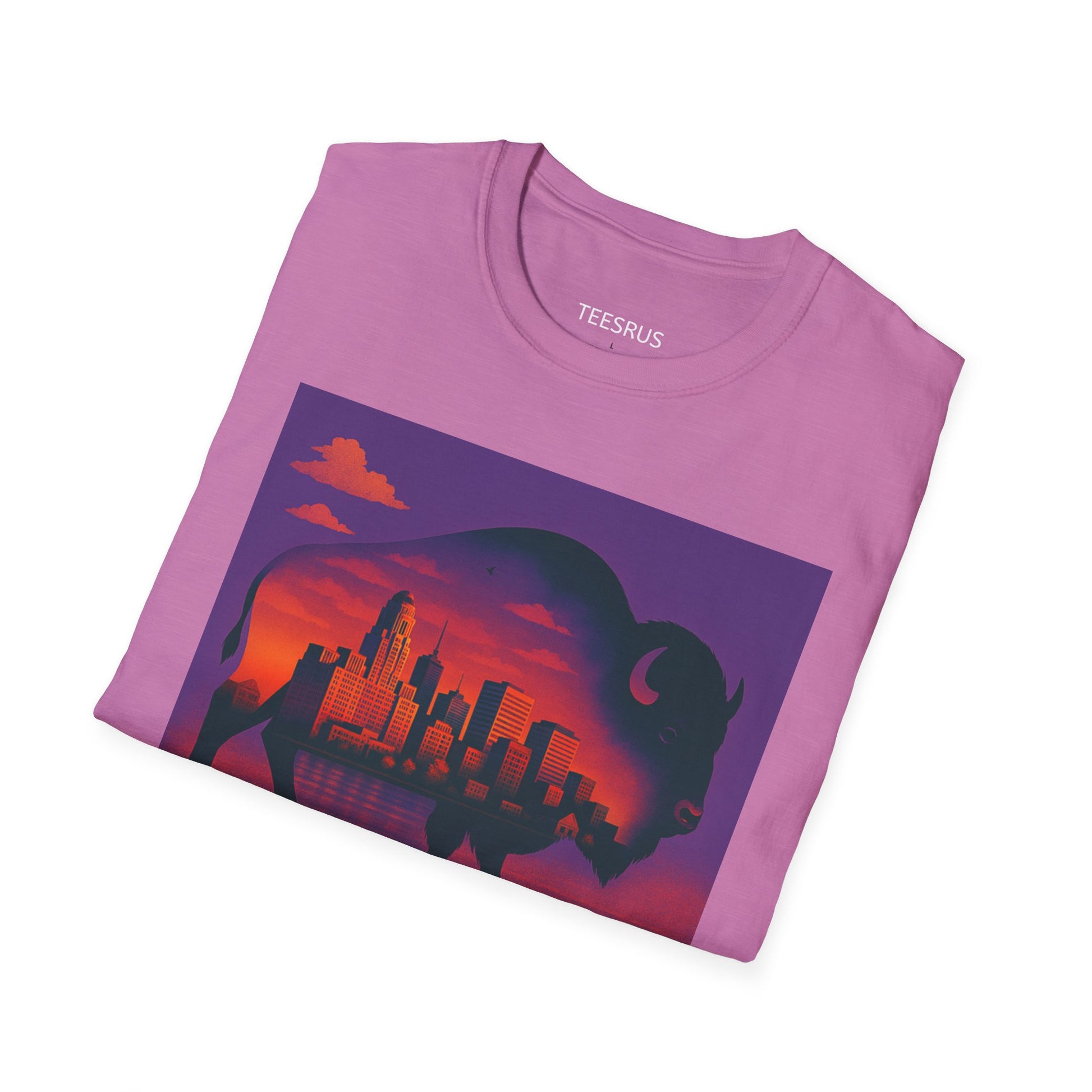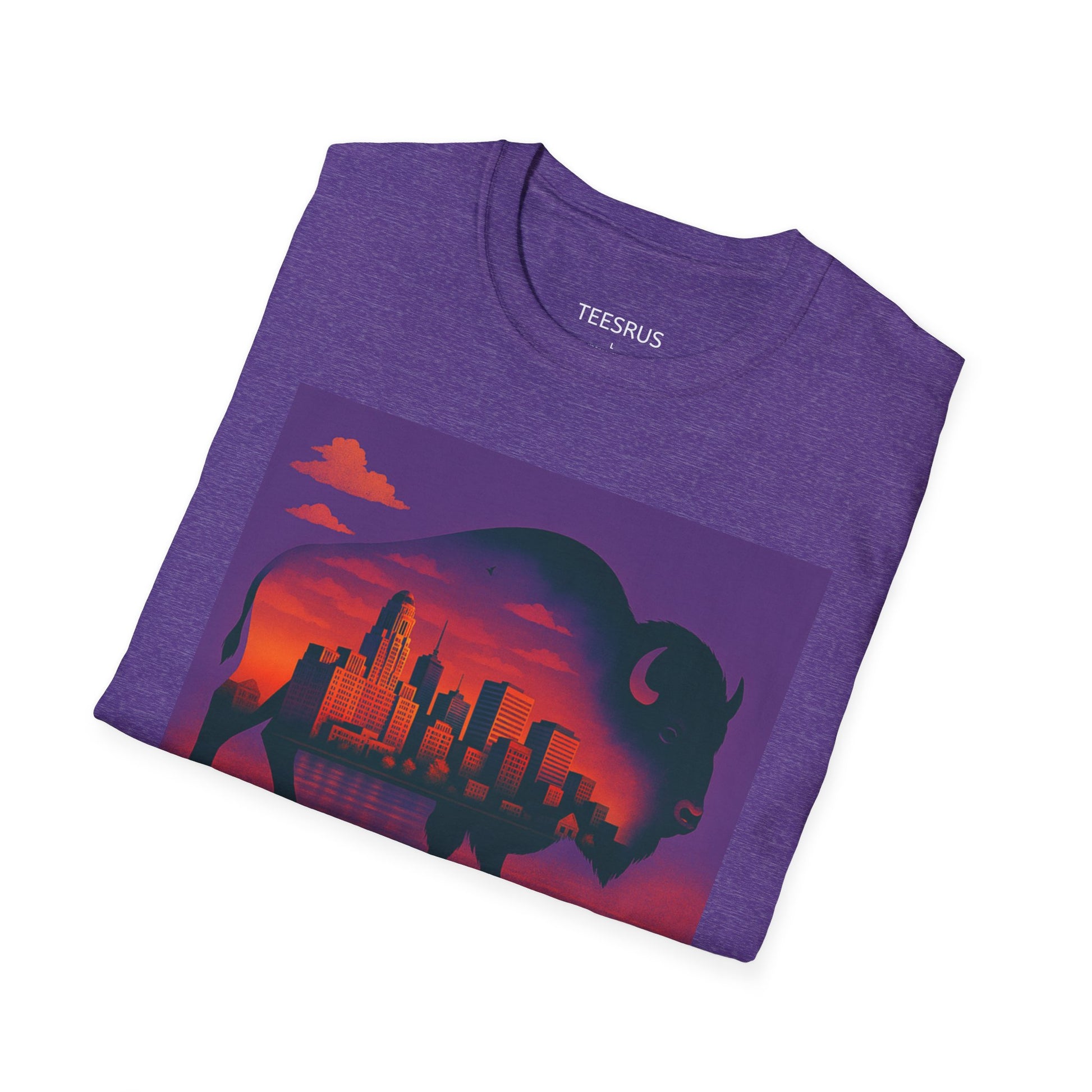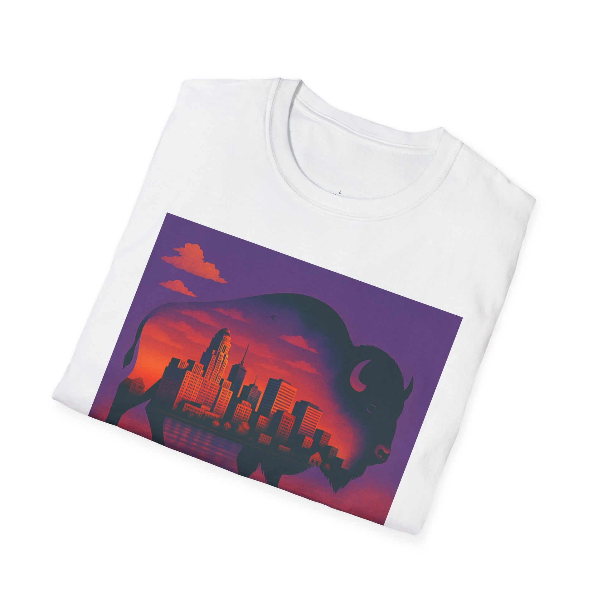 A unisex softstyle T-Shirt featuring a unique 'BUFFALO INSIDE BUFFALO' design. The lightweight fabric and classic fit provide comfort and versatility for any occasion. Ideal for adults looking for a quirky and fun addition to their wardrobe, perfect for casual wear or as a conversation starter. Suitable for holidays like Thanksgiving or casual gatherings with friends.
