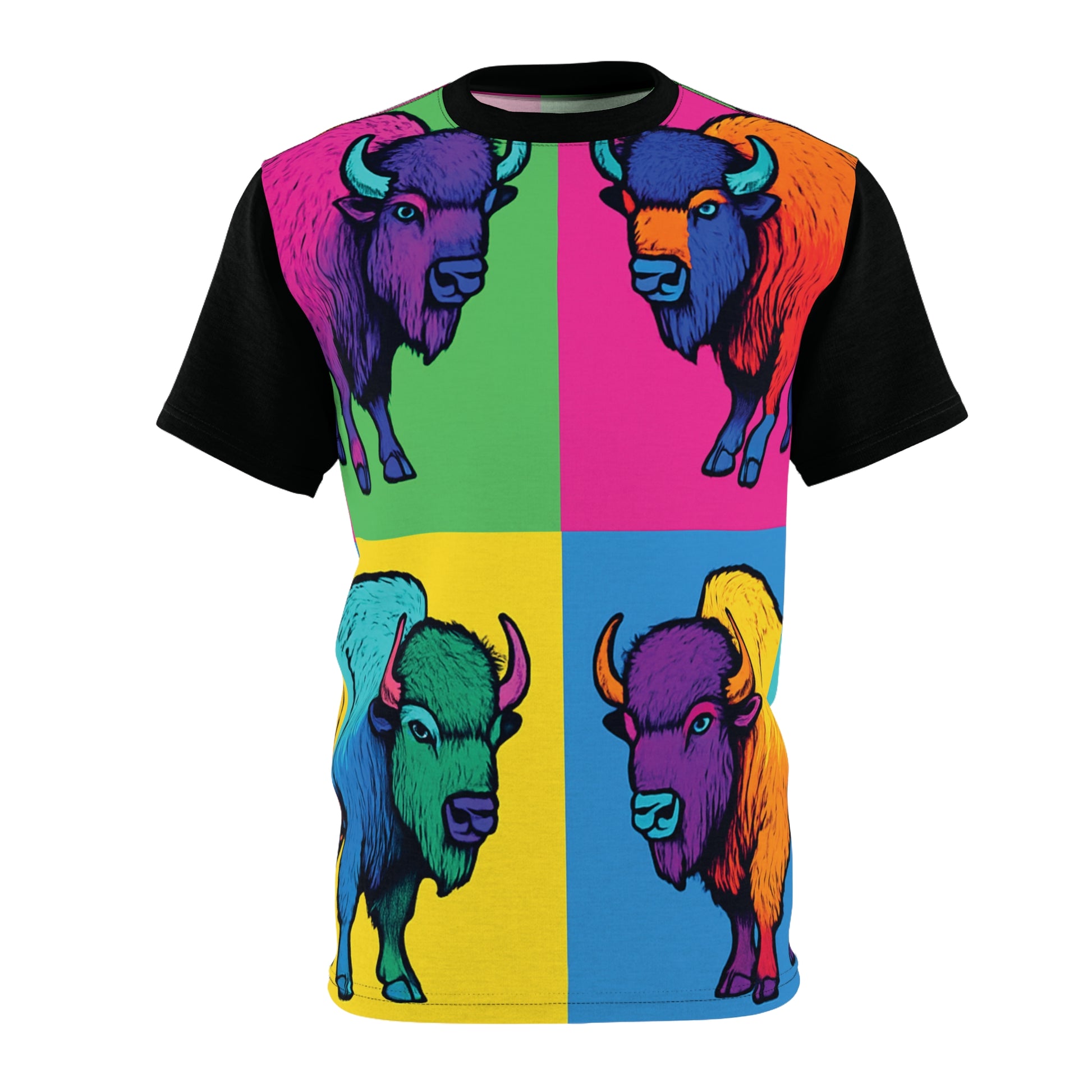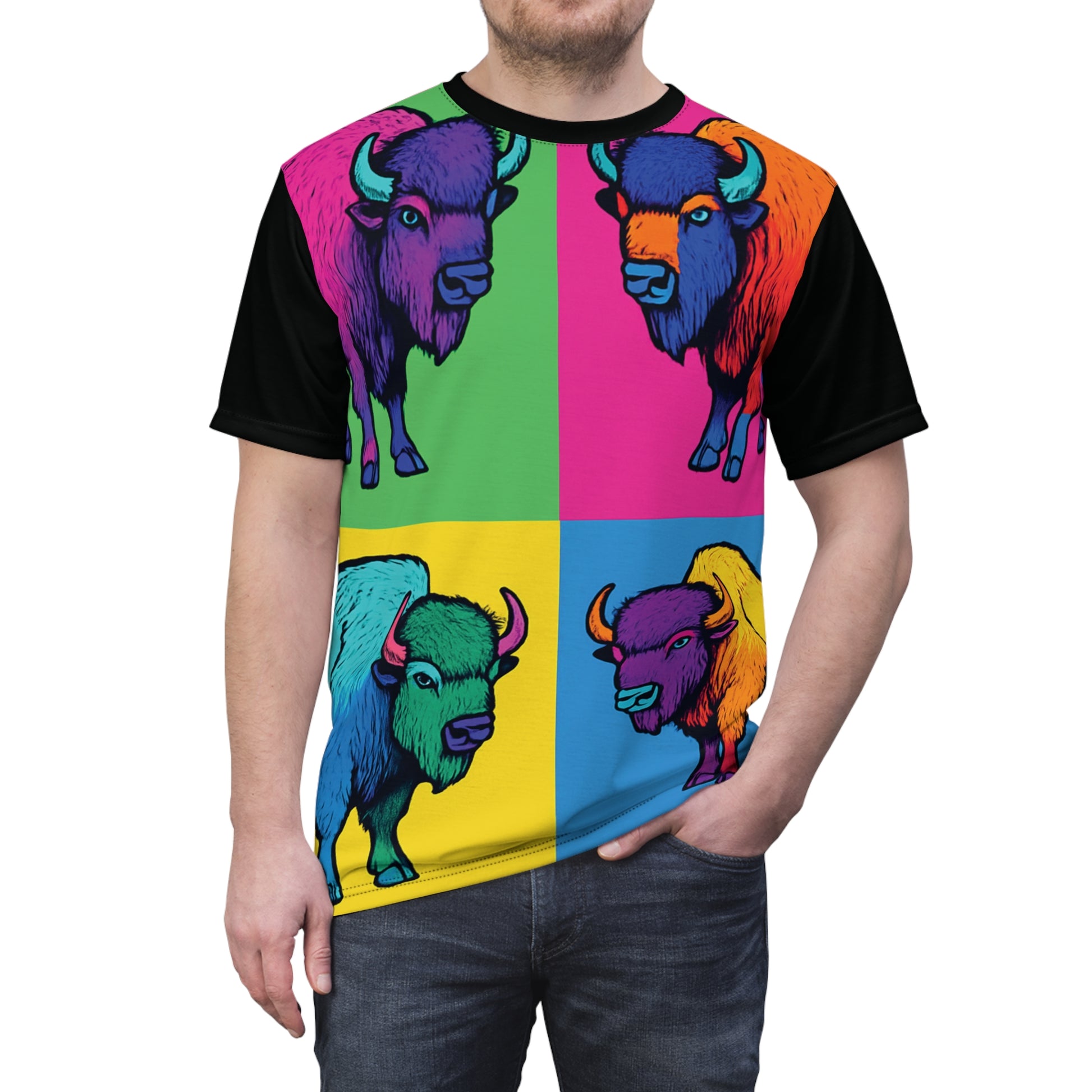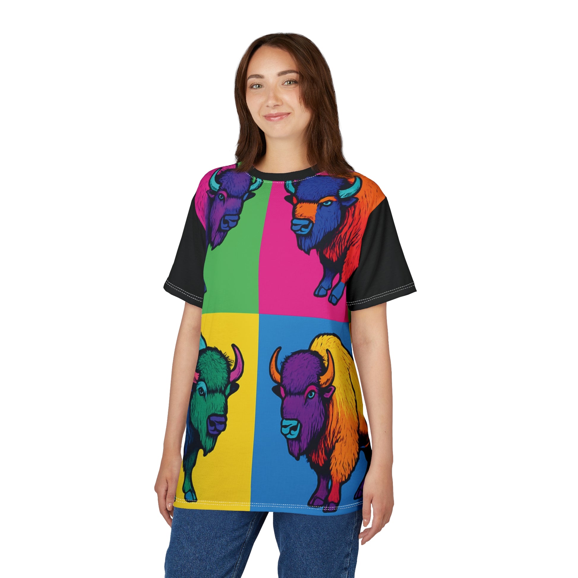 Full size Neon Buffalo eclectic shirt made from 100% Polyester with a regular fit. The vibrant design gives off a fun and playful vibe, perfect for casual wear or a statement piece. Ideal for those who love unique and eye-catching clothing. Relevant for festivals, concerts, and casual gatherings.