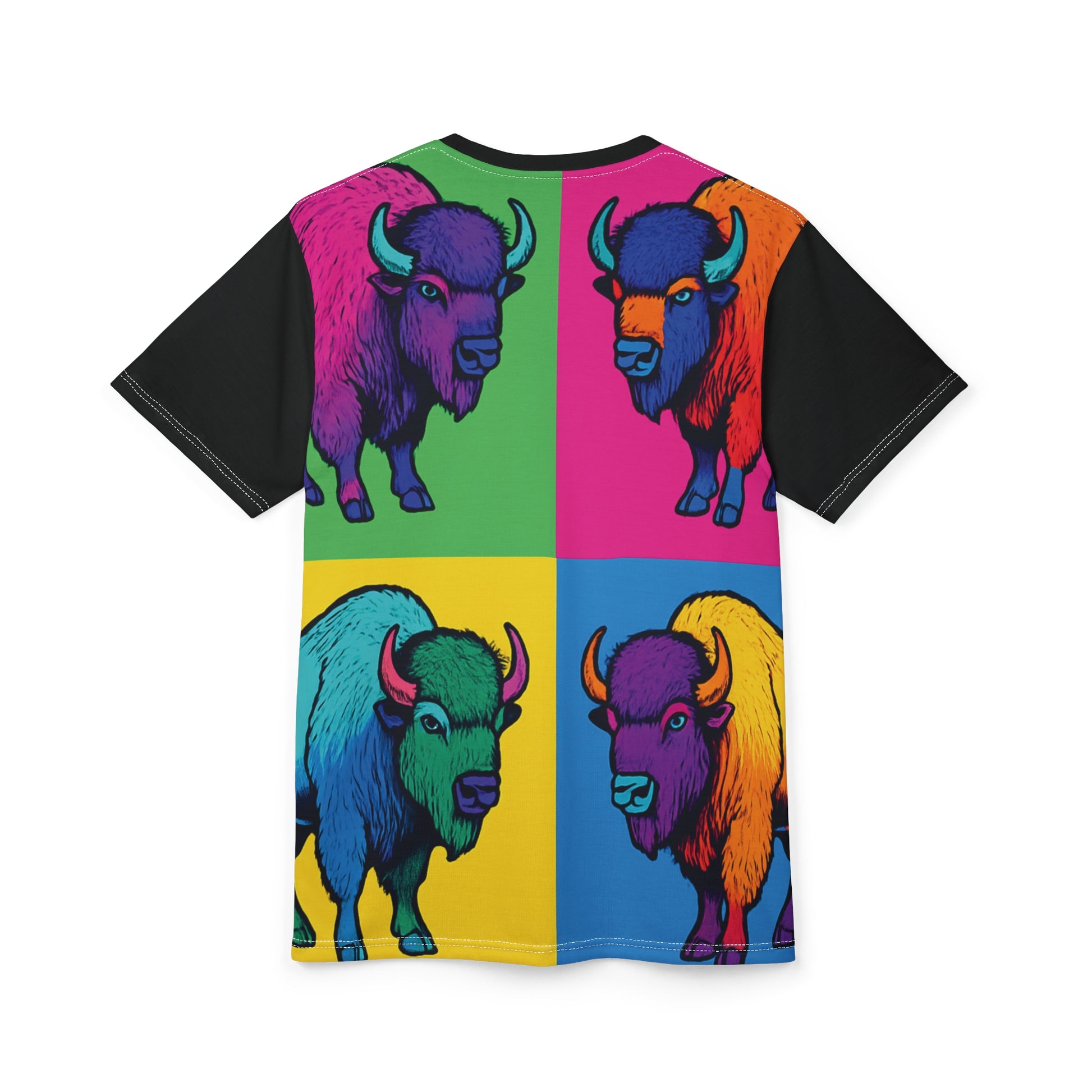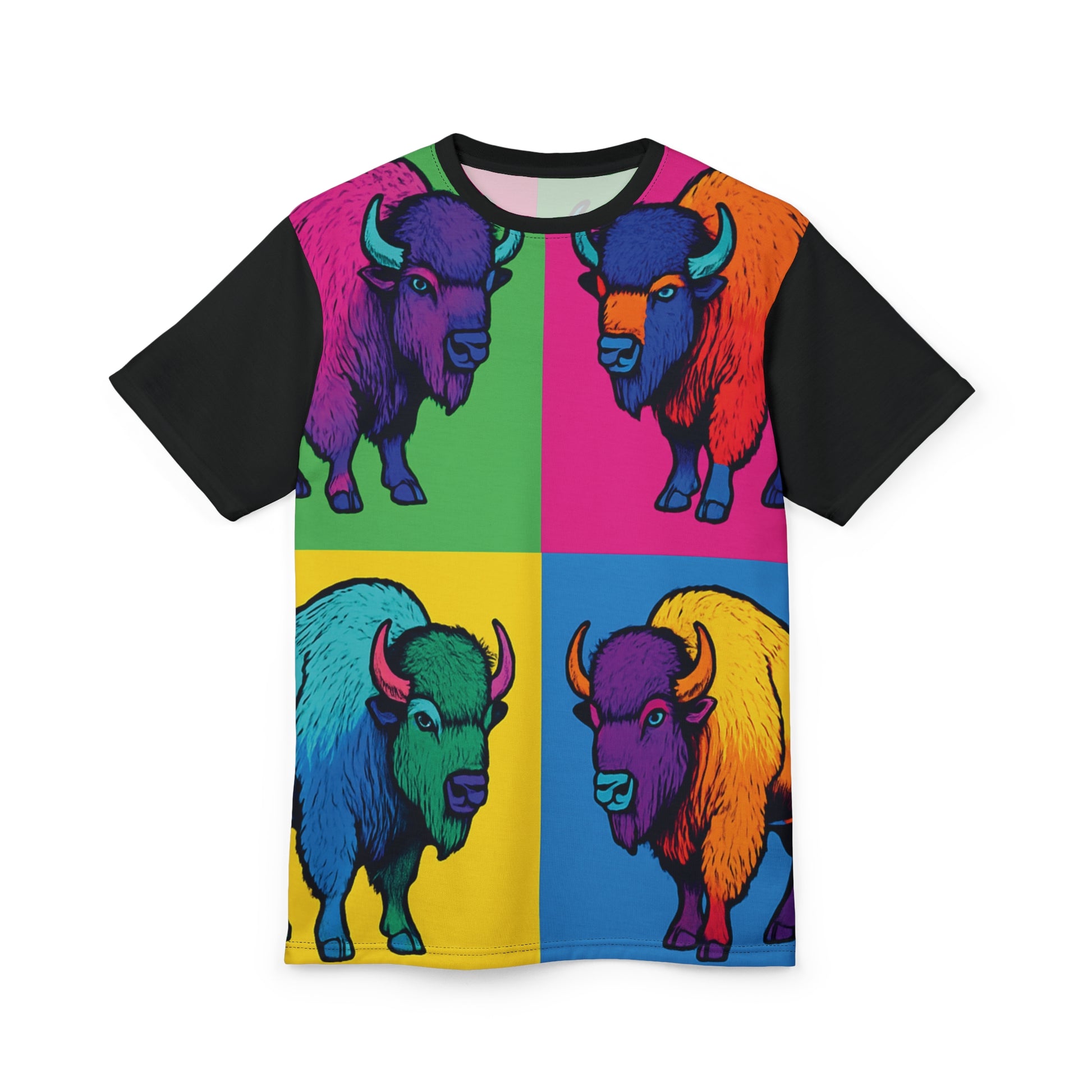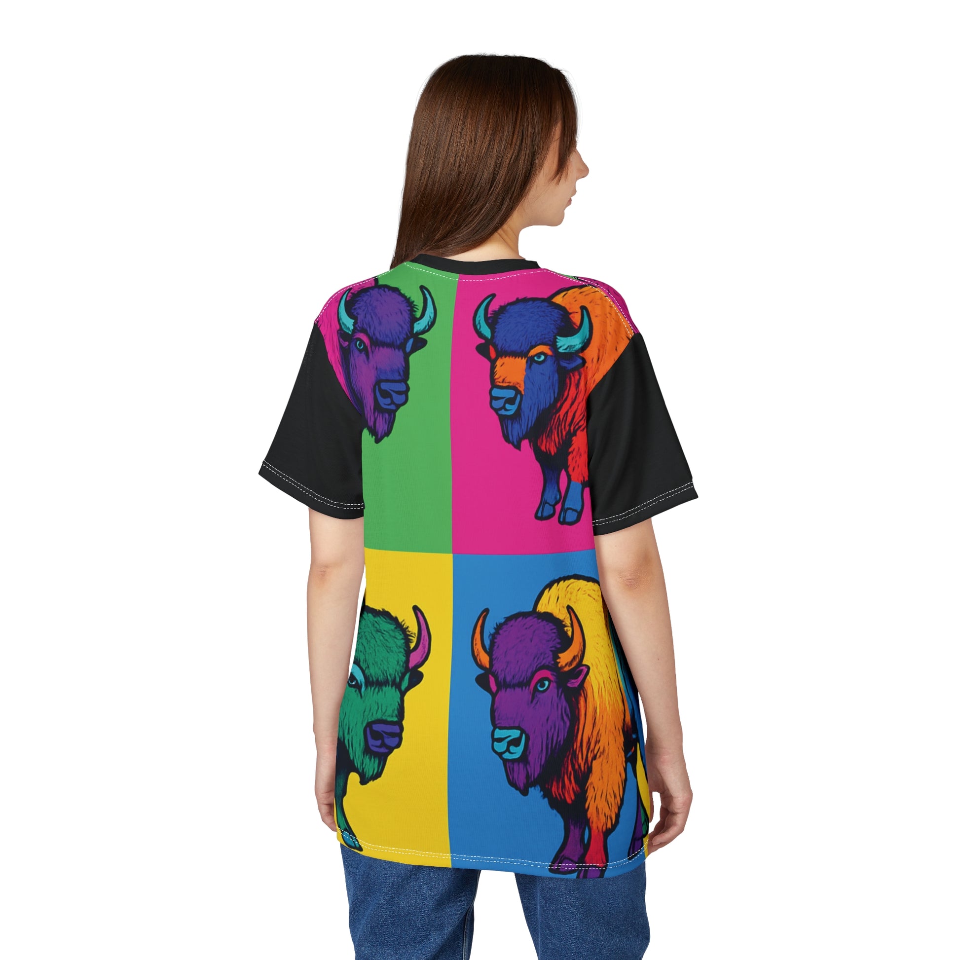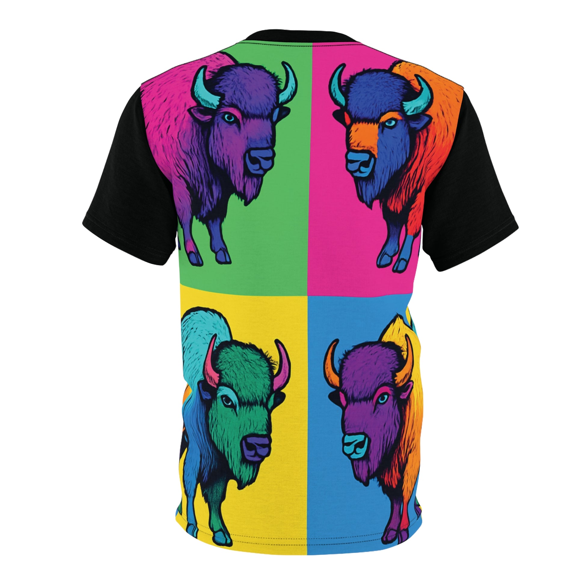 Full size Neon Buffalo eclectic shirt made from 100% Polyester with a regular fit. The vibrant design gives off a fun and playful vibe, perfect for casual wear or a statement piece. Ideal for those who love unique and eye-catching clothing. Relevant for festivals, concerts, and casual gatherings.